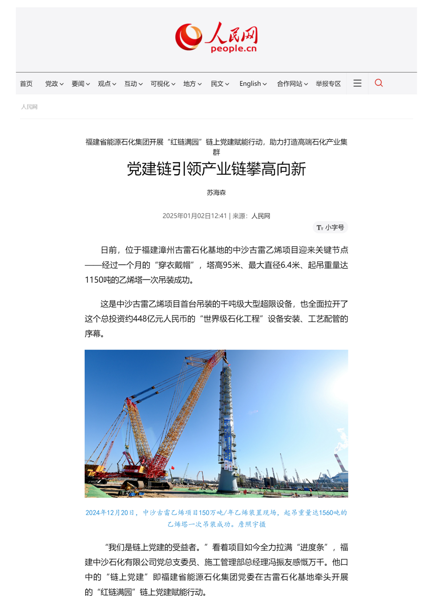 1月2日,人民网、“人民网 ”客户端等多个平台刊登《福建省能源石化集团开展“红链满园”链上党建赋能行动,助力打造高端石化产业集群 党建链引领产业链攀高向新》一文,全文如下——